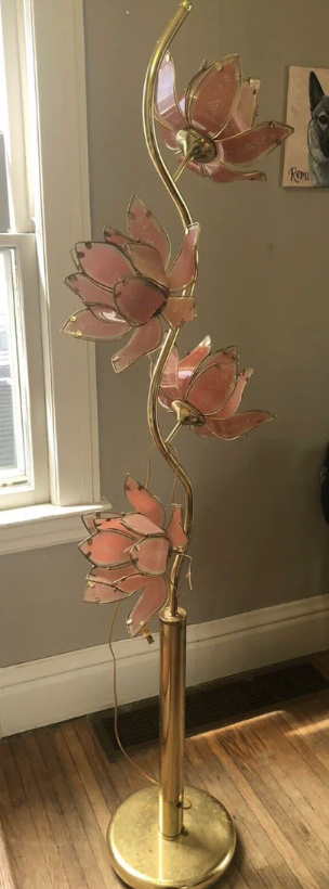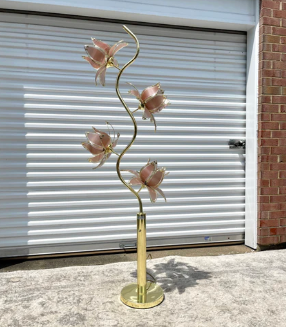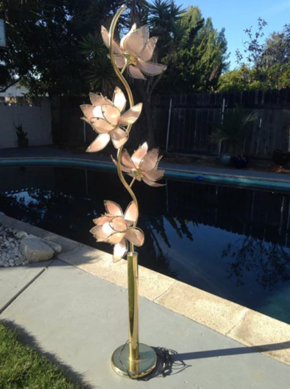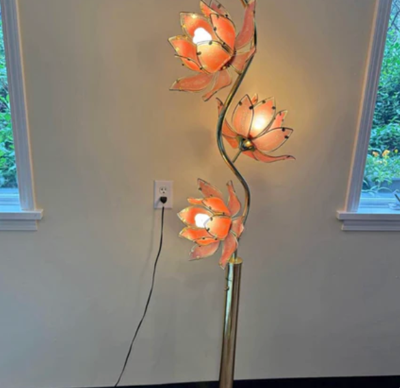 A spectacular Vintage Hollywood Regency white Glass Lotus Flower Floor Lamp.This dramatic lamp boasts four huge glass flowers. The light makes a beautiful statement both day and night. It is a bouquet of flowers that will bloom 365 day's a year, 24/7.